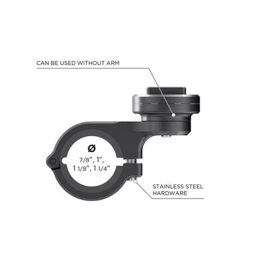 Gắn ốp lưng điện thoại SP Connect hoặc các thiết bị phù hợp khác của bạn vào ngàm gắn SP Moto Mount Pro. Sản phẩm được gia công từ CNC từ nhôm của máy bay, phù hợp với tay lái tiêu chuẩn và ngoại cỡ.