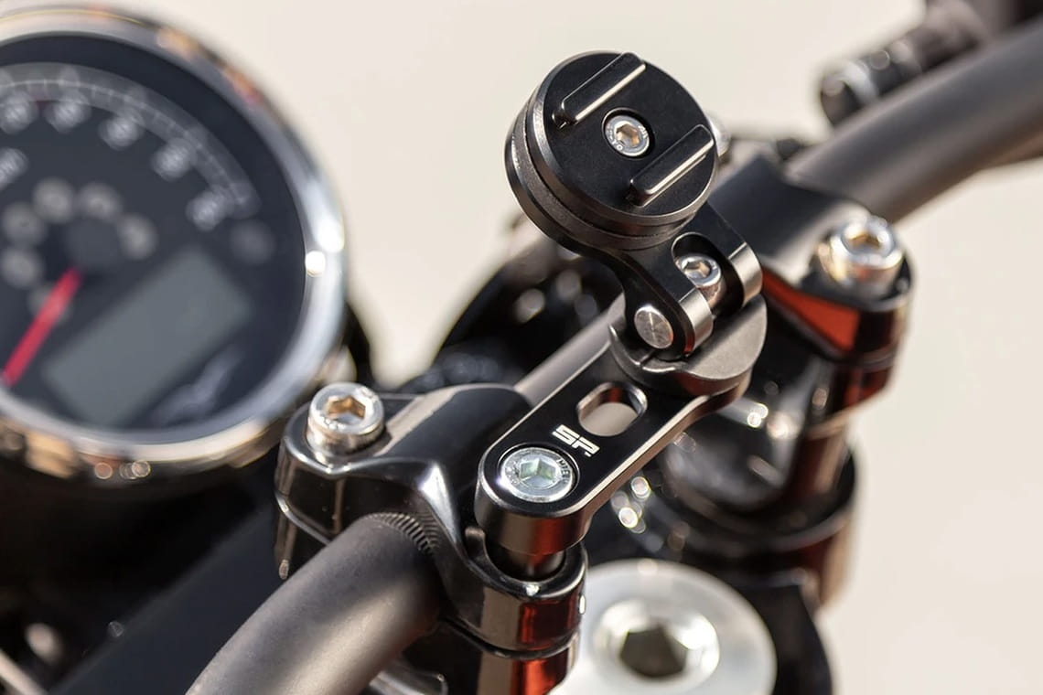 Simply screw this sleek aluminum bracket onto your motorcycle's clamp bar and you're ready to mount your SP Connect™ PHONE CASE (or UNIVERSAL INTERFACE) by placing it on the bracket and turning it 90 degrees. degrees clockwise.