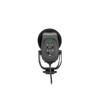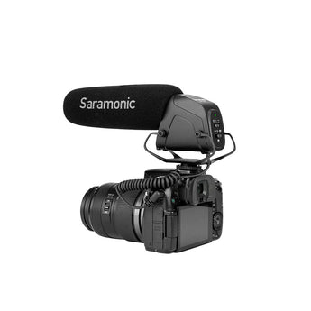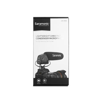 The Saramonic SR-VM4 shotgun microphone is a lightweight condenser microphone that specializes in providing audio for DSLR cameras and camcorders. The SR-VM4 allows you to adjust the audio level control (-10dB, 0dB, +20dB) and low-cut filter (75Hz) to make dialogue clearer.