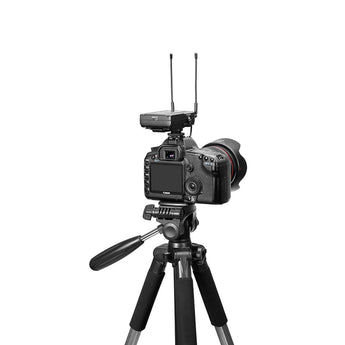 - Includes a camera-attachable wireless receiver, a wireless transmitter, and a clip-on lavalier microphone.