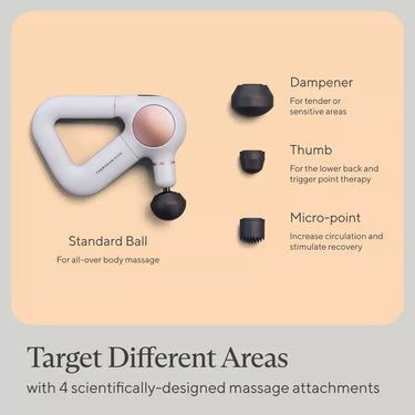- 4 phụ kiện được để điều trị các điểm khác nhau trên cơ thể: Dampener, Standard Ball, Thumb và Micro-point