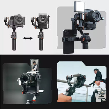 Dùng được cho cả điện thoại, camera action, máy ảnh nhỏ và DLSR, bạn hoàn toàn có thể thoải mái quay ngoài trời ở bất kì nơi đâu. Bạn sẽ có cho mình những khung hình cũng như khoảnh khắc siêu chất và ấn tượng. Các tính năng hiện đại kèm theo cố định 3 trục và bộ cảm biến AI sẽ giúp bạn đạt được những thước phim như ý.