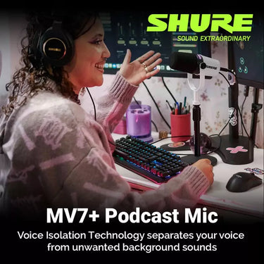 Microphone Shure MV7+ có công nghệ Voice Isolation để tập trung vào giọng của bạn và tránh những tiếng ồn nền không mong muốn, đảm bảo âm thanh tuyệt vời ngay cả trong môi trường ồn ào.