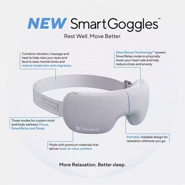 Therabody Smart Goggles (hoặc SmartGoggles) là một máy mát xa mắt duy nhất được trang bị công nghệ SmartSense - cảm biến sinh học độc quyền của của hãng có khả năng tùy chỉnh liệu trình massage phù hợp để giảm nhịp tim, mang lại sự thư thái nhất có thể.